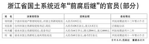 事實(shí)上,據(jù)統(tǒng)計(jì),不僅是浙江,近年來落馬的貪官不少都與房地產(chǎn)潛規(guī)則下的腐敗有關(guān),財(cái)政部原副部長朱志剛,北京市原副市長劉志華,山東省委原副書記、青島市委原書記杜世成,天津市政法委原副書記、天津市人民檢察院原檢察長李寶金,湖南省郴州市原市委書記李大倫,安徽省原副省長何閩旭,昆明市規(guī)劃局原局長曾華,上海房地局原副局長殷國元,江蘇省蘇州市原副市長姜人杰,重慶市規(guī)劃局原局長蔣勇,重慶市沙坪壩區(qū)原副區(qū)長陳明,福州市國土資源局原局長王炳毅,福州市倉山區(qū)土地局原局長李仲……都與房地產(chǎn)腐敗有關(guān)。