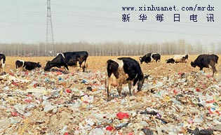 河邊是一片散發(fā)著臭味的垃圾場,紅的、白的、黃的、灰的、黑的,各色垃圾堆滿了一地。附近養(yǎng)殖場的幾頭奶牛每天都踱步來到小河邊喝水,喝足水的奶牛習(xí)慣性地來到垃圾場上咬咬啃啃,搜尋著可吃的東西。