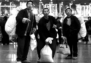 一些小販也趁機(jī)在車(chē)站外當(dāng)起“山寨”搬運(yùn)員。來(lái)自四川的張師傅拉著小滑車(chē)找生意,幫旅客把行李從下車(chē)點(diǎn)搬到車(chē)站門(mén)口!安还芏嗌侔,裝滿(mǎn)一小車(chē)10塊錢(qián)!