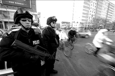 昨天上午,記者在西單文化廣場(chǎng)前看到,一輛武裝處突車閃爍著警燈?吭诼放裕瑑擅碇鲬(zhàn)服的特警隊(duì)員全副武裝,警覺(jué)地注視著長(zhǎng)安街附近的人流和車流。