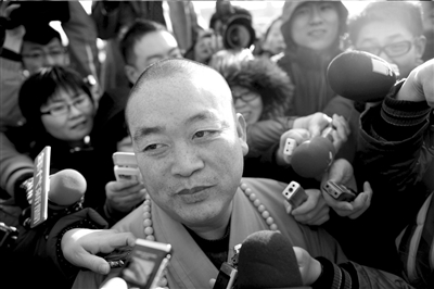 每次人大代表“走紅地毯”時(shí),圓臉?lè)蕉、身穿黃色袈裟、足蹬黑色布鞋的全國(guó)人大代表、少林寺方丈釋永信一出現(xiàn)在廣場(chǎng)上就會(huì)被記者團(tuán)團(tuán)包圍,“方丈,聽(tīng)說(shuō)你開(kāi)越野車(chē)”“方丈,你現(xiàn)在是住在大別墅了吧?”……面對(duì)大家拋出的各種問(wèn)題,他不急不惱,邊低聲念“阿彌陀佛”邊試圖向密不透風(fēng)的人墻外移動(dòng)。見(jiàn)叱咤少林寺的大師卻被眾人圍堵得步履維艱,好事者喊了句“大師,用輕功啊”!大師就是大師,面對(duì)記者們刁鉆的問(wèn)題,他往往用微笑代替回答,“我知道,就算我不說(shuō)話,也會(huì)成為新聞”。