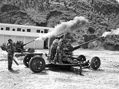 “瞄準(zhǔn)目標(biāo),發(fā)射!”隨著茅坪作業(yè)點(diǎn)指揮員呂鳳弟一聲令下,3枚炮彈瞬即射向?yàn)踉,全部命中目?biāo)……短短17分鐘,187枚炮彈從6個(gè)作業(yè)點(diǎn)相繼射向?yàn)踉啤?