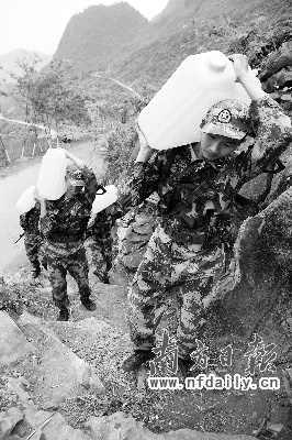 告別巖門(mén)屯許大媽家時(shí),已是中午1時(shí)多,官兵們顧不上吃午飯,拎著空桶又急匆匆向山下走去,他們要在就近的山澗采集清泉,為給下一個(gè)村的老百姓送水爭(zhēng)取時(shí)間……(南方日?qǐng)?bào)特派記者洪奕宜 通訊員李三紅 發(fā)自廣西百色)