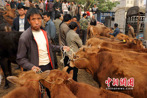 秦大章夫婦看上了馮元達(dá)一頭不到兩歲的小牛,“沒換牙齒、蹄也不錯!鼻卮笳潞軆(nèi)行的告訴記者。在此后近30分鐘的時間里,一場在2300元至1900元人民幣之間的價錢拉鋸戰(zhàn)進(jìn)行起來。最終,在周邊人的撮合下,秦大章以2010元的價錢買到了他看上的小牛。