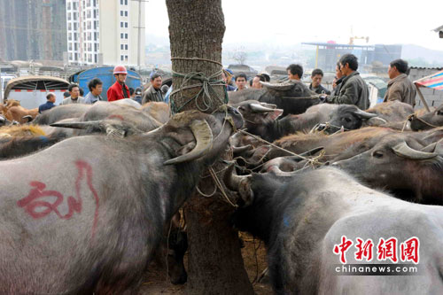 近中午時間,市場里買賣的人群還未散去。秦大章夫婦牽著剛買的;丶伊,這得花上2、3個小時的時間;氐郊遥古5乃质且粋問題,“沒干凈水夠它喝,只能像鄰居那樣把洗菜、洗臉腳的水留下給牛喝。”秦大章的妻子說。雖然羨慕村里有人可以用機器耕地,但家里的4、5畝地多在石頭叢生的半山腰上,秦家夫婦還是只能選擇最傳統(tǒng)的牛耕方式。