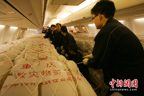 中新網(wǎng)重慶4月15日電 (郭晉嘉 車琳)15日下午,重慶首批救援物資開始在重慶江北國(guó)際機(jī)場(chǎng)裝機(jī)準(zhǔn)備啟運(yùn)青海地震災(zāi)區(qū)。當(dāng)日凌晨1時(shí)54分、2時(shí)7分,已先后有兩架載著抗震救災(zāi)官兵和器材的飛機(jī)從重慶江北國(guó)際機(jī)場(chǎng)起飛,帶著重慶人民的深情厚誼飛往青海西寧。