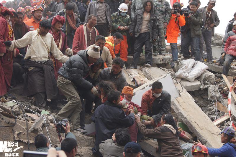 玉樹大地震發(fā)生54小時后,4月16日13時48分,在玉樹縣結(jié)古鎮(zhèn)勝利路上的一堆廢墟里,救援隊員和藏區(qū)群眾一起,成功營救了一位名叫次乃擁青的13歲藏族女孩。