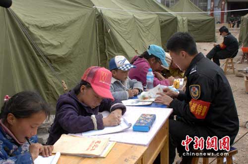 中新網(wǎng)成都4月18日電(陳鳳丹) 18日上午9點(diǎn),位于玉樹縣民族中學(xué)的成都特警隊(duì)員駐地里,地震后的第一堂課開課了。