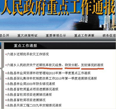 打開麗江市、縣政務網(wǎng),記者發(fā)現(xiàn)永勝縣六德鄉(xiāng)政府一份看似不起眼的“通報”,該通報也是目前記者在麗江“網(wǎng)絡問政”過程中發(fā)現(xiàn)的麗江市鄉(xiāng)級政府相關抗旱救災款物流向通過政務網(wǎng)向社會公開唯一鄉(xiāng)政府。
