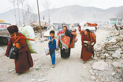 青海師范大學(xué)3年級(jí)學(xué)生伊西措毛是在15日凌晨?jī)牲c(diǎn)趕回玉樹(shù)的,但夜色并不能完全向她掩蓋地震造成的創(chuàng)傷。她路過(guò)結(jié)古鎮(zhèn)口塌掉的瑪尼堆,這是全世界最大的一個(gè),曾讓玉樹(shù)人引以為傲;她路過(guò)勝利路和民主路交界的三叉路口,原先最繁華的商業(yè)中心已經(jīng)被夷為平地;最后,她來(lái)到自己的家門口,這里保存著她從4歲開(kāi)始的所有夢(mèng)想。