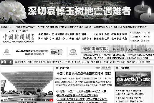 玉樹地震已過去數(shù)日,舉國上下對遇難同胞表示深切哀悼。中國國務院決定,2010年4月21日全國哀悼,全國和駐外使領館下半旗致哀,停止一切公共娛樂活動。目前中國各大網(wǎng)站主頁都已更為灰色,各大網(wǎng)絡游戲服務器也都暫停,中國互聯(lián)網(wǎng)連同中華兒女致哀。