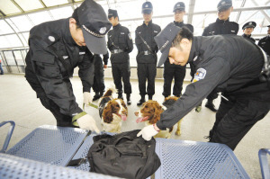 昨天上午10點(diǎn),在南京地鐵一號(hào)線新街口站,在人來人往的客流中,大家無一例外地將目光聚焦在了地鐵公安分局新街口派出所的門口。因?yàn)樵谂沙鏊拈T口,有一支隊(duì)伍正在集結(jié),他們個(gè)個(gè)身強(qiáng)體壯,精神抖擻;在隊(duì)伍的最前面,是兩只外形碩大但卻顯得憨態(tài)可掬的“史賓格”犬。沒有鮮花和標(biāo)語,沒有領(lǐng)導(dǎo)致辭,也沒有熱鬧歡騰的成立慶典,南京警方的第一支地鐵軌道交通乘警大隊(duì)就這樣悄悄地成立了。從籌備到招聘特勤隊(duì)員開始突擊培訓(xùn)再到上崗巡邏,地鐵警方僅用了一個(gè)月的時(shí)間。這支目前由十位民警和三十位特勤保安以及四只訓(xùn)練有素的“史賓格”搜爆犬組成的乘警大隊(duì)將擔(dān)負(fù)起地鐵一號(hào)線以及即將開通的二號(hào)線全線的車廂巡防任務(wù)。