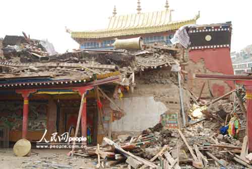 距結古鎮(zhèn)約20公里的禪古寺是該地區(qū)噶舉派最大的寺院,也是地震中損毀最嚴重的寺廟,3個主殿堂損毀兩座,經(jīng)堂全部倒塌,有260間僧房與兩個閉關等也被全部毀壞,更重要的是還有大量佛教用品和珍貴文物埋在廢墟下。