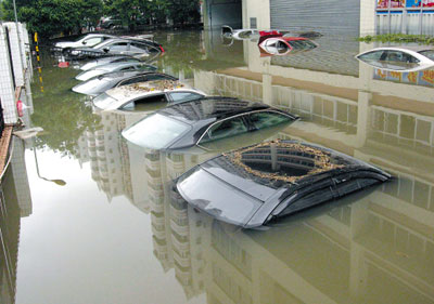 今晨,經(jīng)過一夜暴雨后,廣州白云區(qū)黃石路一處停車場,多輛車輛遭遇“沒頂之災(zāi)”。鄭迅攝(圖片來源: 羊城晚報)