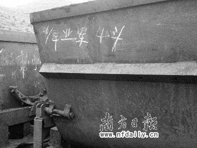 記者昨日在現(xiàn)場(chǎng)看到,礦井出口處擺著9名死難礦工的遺體,遺體旁是一排車斗,一個(gè)車斗上還有工頭用白色粉筆記錄下的死者李業(yè)軍5月26號(hào)的產(chǎn)量———早班4斗。