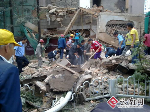 記者現(xiàn)場了解到,今天上午11時15分左右,云南飯店在拆遷過程中突然發(fā)生倒塌。靠東風(fēng)西路一邊正在被拆遷的一堵高大約7米的墻體砸向公交站臺,一輛5路公交車正在站臺上下客,由于墻體離公交站臺非常近,正在下車的兩名乘客(一男一女)被砸傷。隨后,救護車迅速趕往現(xiàn)場,目前,兩名傷者均已被送往醫(yī)院搶救,傷勢尚不清楚。