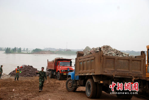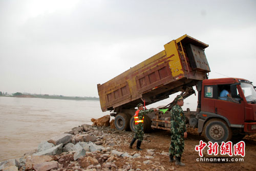 離決堤口不遠(yuǎn),武警水電部隊設(shè)立了臨時指揮部,再往前有武警戰(zhàn)士在指揮車輛卸倒石料,大塊大塊的礦石落入水中,砸起一朵朵浪花,旁邊還停留了一艘水文部門的監(jiān)測船。