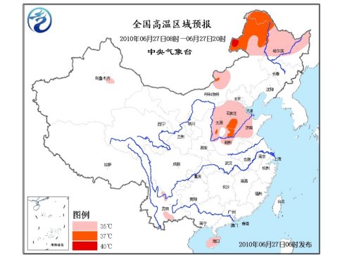 中新網(wǎng)6月27日電 中央氣象臺6月27日06時繼續(xù)發(fā)布高溫藍色預警:預計,今天白天,內(nèi)蒙古東北部和中部的部分地區(qū)、黑龍江大部、山西大部、河北中南部、京津南部、河南北部、山東中西部、海南大部等地有35~37℃的高溫天氣,其中,內(nèi)蒙古東北部、黑龍江西北部、河北南部等地局部最高氣溫可達38℃以上。