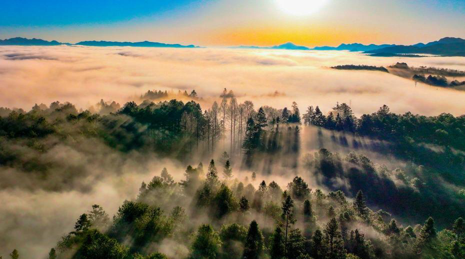 夏日,航拍位于貴州省畢節(jié)市七星關(guān)區(qū)的拱攏坪國有林場綠意盎然,景色怡人。拱攏坪國有林場總面積超過5萬畝,森林覆蓋率超95%,是烏江、赤水河等流域的重要生態(tài)屏障。