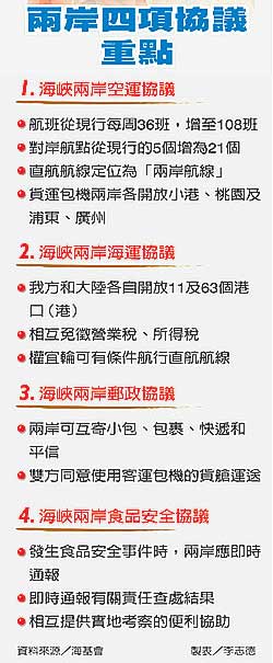 報(bào)道說,兩會副董事長、副會長層級協(xié)商昨天敲定空運(yùn)、海運(yùn)、郵件及食品安全等四項(xiàng)協(xié)議,今天將由;鶗麻L江丙坤及海協(xié)會會長陳云林舉行二次江陳會談,簽署協(xié)議。其中空運(yùn)、海運(yùn)、郵件等三項(xiàng)協(xié)議在簽署四十天后生效,食品安全協(xié)議在七天后生效。