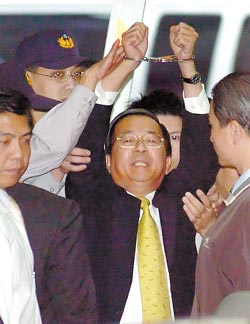 下午四點三十分陳水扁在走下特偵組時樓梯口,他收起不安的情緒高舉雙手,向媒體秀出上銬的雙手,大喊“政治迫害”、“司法冤獄”,并連續(xù)喊了兩次“臺灣加油”后,匆匆坐上特偵組公務車,直奔臺北地院。