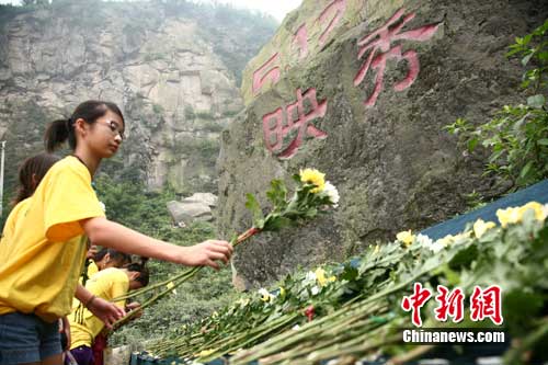 中新網(wǎng)成都7月31日電 (徐楊祎 張浪)31日,來(lái)自歐美大陸的170多位海外華裔青少年,前往“5·12汶川地震”震中映秀鎮(zhèn),參觀地震遺址,寄托哀思。在地震飛來(lái)石祭臺(tái),同學(xué)們自發(fā)購(gòu)買鮮花,深切哀悼在地震中不幸遇難的同胞們。