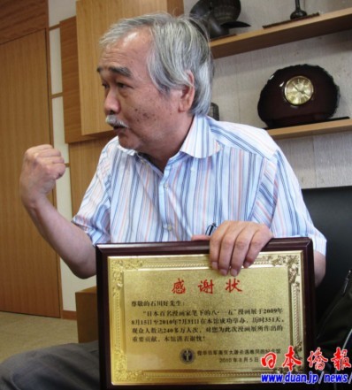 中新網(wǎng)9月2日電 據(jù)《日本僑報(bào)》報(bào)道,著名日中友好人士、前日中友好二十一世紀(jì)委員會(huì)日本委員石川好,日前收到侵華日軍南京大屠殺遇難同胞紀(jì)念館寄來的感謝狀,感謝石川好和日本漫畫家在該館成功舉辦“日本百名漫畫家筆下的8·15”展覽的事跡。
