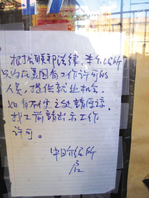 報道指出,在7日執(zhí)法行動中有一名石姓女子被捕的中日職業(yè)介紹所仍繼續(xù)關門,8日一早門上就張貼出中英文告示,明確告訴找工者必須有工作許可證。