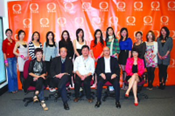 評委與十二佳麗合影。前排中為黃宗榮,右二為高文輝,左二為冼寶安。