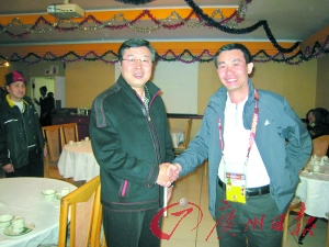 “你好!沒有想到我們又見面了!弊蛱焱砩希浾咤忮说街袊v約翰內(nèi)斯堡領(lǐng)事館房利總領(lǐng)事,記者數(shù)月前來南非作賽前采訪時,房總領(lǐng)事就曾經(jīng)親切接見過本報記者,并與記者共進(jìn)晚餐。這次約堡再度重逢,相當(dāng)熱情。