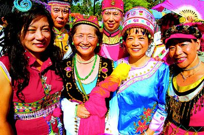 1977年赴美的臺(tái)灣原住民曹開(kāi)梅女士此次第一次與會(huì),身著靚麗民族服飾與許多來(lái)自中國(guó)大陸的回族、滿族、彝族等少數(shù)民族朋友一起組成少數(shù)民族方陣,亮相蒙市升旗儀式。