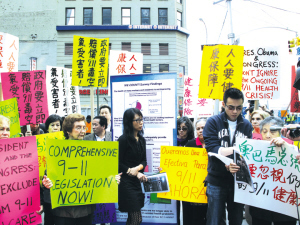 當(dāng)天有不少華人職工會的會員到場聲援,華人職工會也是超越姐妹樓聯(lián)網(wǎng)的組成者之一,居住在下東城的伍嬸代表發(fā)言,她說過去8年來華埠及下城的居民健康仍然被忽略,受到各種疾病的折磨,她與孫女于911后受毒空氣影響,她的肺部出現(xiàn)黑點(diǎn)、孫女患上哮喘,然而政府卻一直不肯正視有關(guān)問題。