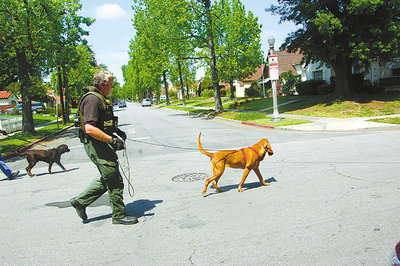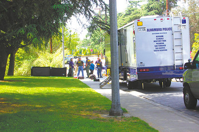 阿罕布拉市警方出動警犬,在女尸命案現(xiàn)場展開搜索,但并無所獲。 (美國《世界日報》/吳忠國攝影)
