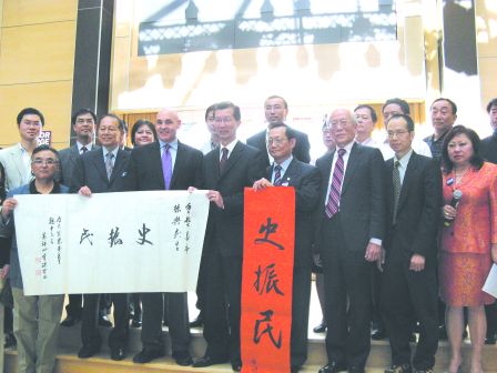 史振民公布中文名字,獲安省旅游廳長(zhǎng)陳國(guó)治及安省華裔前省議員暨前安河能源廳長(zhǎng)黃景培等具份量人士到場(chǎng)力挺。(邱錦宇等)
