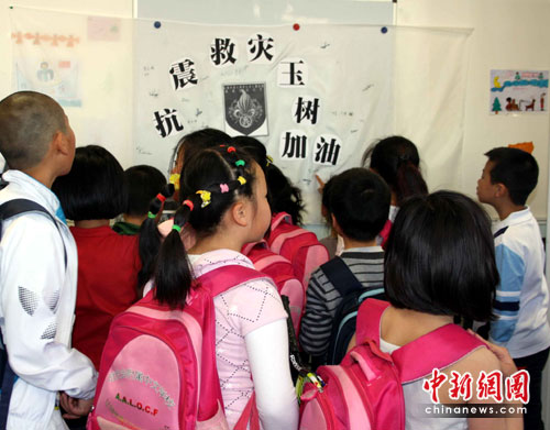 周六下午,是孩子們常規(guī)上中文課的時間。下課的鈴聲一響,孩子們就把自己的零用錢裝進信封,一個接一個地放進捐款箱,然后在寫著"抗震救災 玉樹加油"的橫幅上寫下自己的名字,有些會寫中文的孩子還寫上了“加油”二字。一筆筆稚嫩的筆跡代表著一份份純真的愛心。