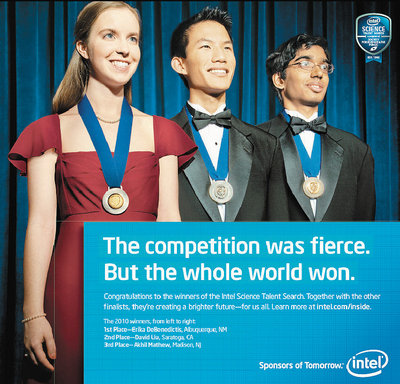 英特爾在廣告中的標(biāo)題及內(nèi)容都很簡單。標(biāo)題為“科學(xué)獎(jiǎng)競爭激烈,贏家是全世界。”廣告內(nèi)容指出,恭賀所有在英特爾科學(xué)獎(jiǎng)的優(yōu)勝者及進(jìn)入最后準(zhǔn)決賽參賽者,他們創(chuàng)造了更光明的未來。