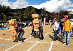 6名中國研修生組成的團(tuán)隊每個人身背5個紙箱,與當(dāng)?shù)厝毡敬迕癖荣愗?fù)重競走。開始的時候,他們年輕力壯走在前面,但當(dāng)?shù)卮迕駪{借著早已掌握這項傳統(tǒng)比賽的技巧后來居上,最終拔得頭籌。競走途中,村民們?yōu)樗麄兏吆啊凹佑汀保瑲夥辗浅狒[。