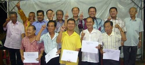 庇勞馬華區(qū)會(huì)主席蔡華輝代表房屋部移交批準(zhǔn)文件予各村長(zhǎng)。