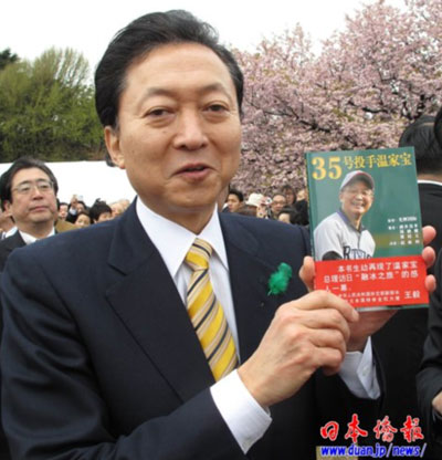 在“賞櫻會”上,受邀參加的日本僑報社張景子社長向鳩山首相贈送了該社出版的《35號投手溫家寶》,鳩山首相欣然收下,并勉勵日本僑報社繼續(xù)為日中交流做貢獻。張景子說,“我們來自中國,在日本創(chuàng)辦的日本僑報出版社致力于日中交流,已經出版了200來本書。2008年出版了中日文版《35號投手溫家寶》,今天特地給您帶來了一本!兵F山首相高興地從張景子手中接過《35號投手溫家寶》一書,仔細端詳,并說:“我下個月就要與溫家寶總理會面。希望你們繼續(xù)努力,為促進日中交流作出更大的貢獻!闭f完,鳩山首相高高地舉起《35號投手溫家寶》一書,讓大家拍照。