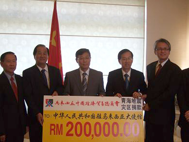 中新網(wǎng)5月6日電 據(jù)中國(guó)外交部網(wǎng)站消息,近日,馬來(lái)西亞馬中經(jīng)貿(mào)總商會(huì)、馬華公會(huì)公共服務(wù)及投訴局以及華商Yap Kim San 先生前來(lái)中國(guó)駐馬來(lái)西亞使館,轉(zhuǎn)交向青海玉樹(shù)地震災(zāi)區(qū)捐款。