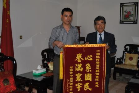 施福建家屬對施遇害后,總領(lǐng)館即派員與警方交涉并協(xié)助家屬迅速處理死者后事表示感謝。高總領(lǐng)事感謝家屬對總領(lǐng)館工作的肯定,并強調(diào),錦旗是對總領(lǐng)館工作的鼓勵,總領(lǐng)館將一如既往地堅持以人為本、外交為民的理念,加大與阿司法機構(gòu)合作力度,努力保障在阿中國公民的人身和財產(chǎn)安全。