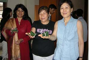當(dāng)把專(zhuān)門(mén)從國(guó)內(nèi)帶來(lái)的蘆葦葉準(zhǔn)備好后,印度朋友們都紛紛圍到廚師身旁,饒有興致地學(xué)習(xí)包粽子,仔細(xì)地詢(xún)問(wèn)如何鋪葉、卷葉、捆扎等細(xì)節(jié),并動(dòng)手制作。粽子煮熟后,印度朋友們高興地品嘗了她們稱(chēng)之為“中國(guó)布丁”的美食,并稱(chēng)贊粽子味道很美。
