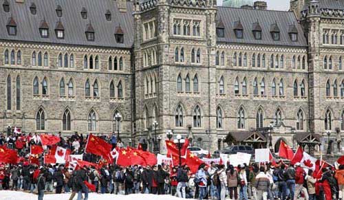 此間媒體發(fā)自現(xiàn)場的報道說,渥太華國會山莊已經(jīng)變成紅色的海洋,到處飄揚著五星紅旗和楓葉旗。組織者估計,與會人數(shù)可能會超過預(yù)期,示威人群幾乎站滿了國會山莊前的草坪。