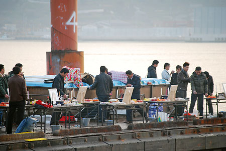 2月2日上午,中國船員家屬來到長(zhǎng)崎漁港,登上停靠在那里的第一山田丸,依次擺放好6名中國船員的彩色遺照。按照中國舟山的習(xí)俗,每幅遺照前面點(diǎn)燃起兩根蠟燭和3個(gè)焚香,擺放好兩束鮮花和從國內(nèi)帶來的紹興花雕酒以及親人日常喜歡吃的水果、糕點(diǎn)……當(dāng)他們最后把一杯一杯的紹興花雕酒灑向大海的時(shí)候,當(dāng)他們悲痛的哭喊聲在甲板上空回蕩的時(shí)候,所有在場(chǎng)的人都潸然淚下。