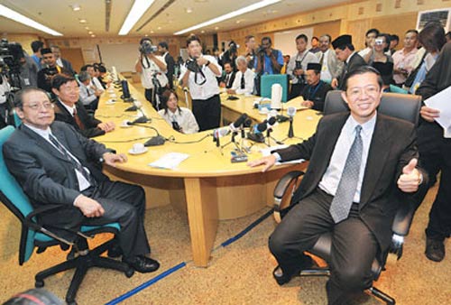 林冠英是在州元首和州元首夫人面前宣誓就任,他是和所領(lǐng)導(dǎo)的民主行動(dòng)黨陣容,在第十二屆全國大選中一舉囊括所有競選的7國19州后,與人民公正黨在檳州組成新政府。人民公正黨一共贏得4國9州席位。