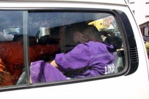 涉嫌謀殺案件的男子以手遮掩臉部,不讓攝影記者拍攝他的樣子。坐在中間的孫櫓華則直視前方,臉上沒有太多的表情。(圖:星洲日報(bào))