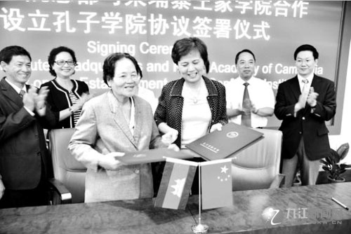 經(jīng)過近兩年的精心籌備,設(shè)立王家學(xué)院孔子學(xué)院的條件已經(jīng)成熟,中柬合作雙方加緊履行申辦孔子學(xué)院的相關(guān)手續(xù)。8月12日,應(yīng)九江學(xué)院的邀請并受宋安副總理的委托,柬埔寨王家學(xué)院院長克洛堤達博士率王家學(xué)院代表團抵達北京,訪問國家漢辦暨孔子學(xué)院總部?鬃訉W(xué)院總部總干事許琳女士會見了克洛堤達博士,雙方分別代表孔子學(xué)院總部和柬埔寨王家學(xué)院,簽署了《中國孔子學(xué)院總部與柬埔寨王家學(xué)院關(guān)于合作設(shè)立王家學(xué)院孔子學(xué)院的協(xié)議》。至此,柬埔寨第一家孔子學(xué)院正式宣告誕生。