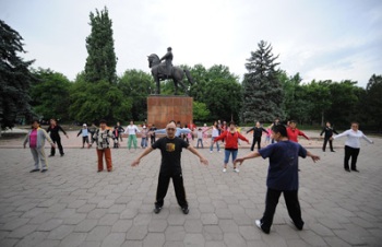 每周二與周五早上八點,武術(shù)班都要在比什凱克市內(nèi)街心公園練習(xí)一小時,此舉吸引了不少過路人的觀看和參與,成為了一道別具特色的風(fēng)景線,很受當(dāng)?shù)孛癖姎g迎。