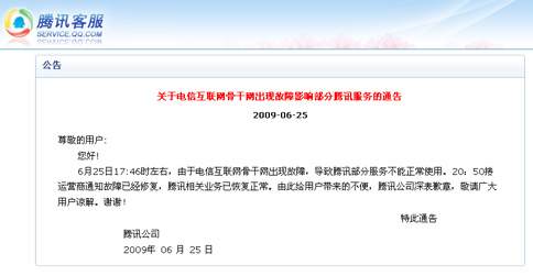 昨晚20時20分許,記者在騰訊官方網(wǎng)上看到一則《關于運營商設備故障影響部分騰訊服務的通告》已經(jīng)發(fā)布,回應稱:6月25日17時46分左右,由于電信運營商出現(xiàn)設備故障,導致騰訊部分服務不能正常使用。騰訊正在積極配合運營商進行故障排除。