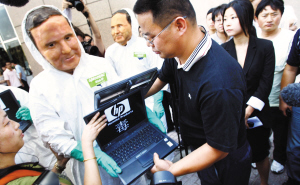 昨天(25日),三位國際環(huán)保組織綠色和平的志愿者出現(xiàn)在惠普中國總部門前,每人手捧一部帶有“毒”字樣的惠普筆記本電腦。綠色環(huán)保一位負(fù)責(zé)人表示,由于惠普推遲其承諾的在產(chǎn)品中消除兩種有毒物質(zhì)的時間,因此用這種方式勸惠普“戒毒”。